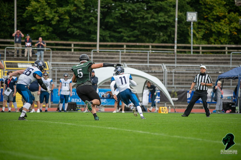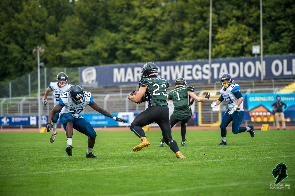 Nur zwei Wochen nach ihrem Rekordsieg gegen die Bremerhaven Seahawks legten die VfL Oldenburg Knights an diesem Samstag noch einen drauf und zerlegten den viermaligen German- und dreimaligen Eurobowl-Sieger Hamburg Blue Devils mit 75:7 in alle Einzelteile. Nun dürfte den Knights der Gruppensieg kaum noch zu nehmen sein.