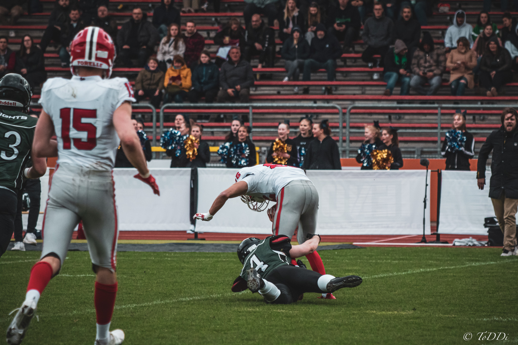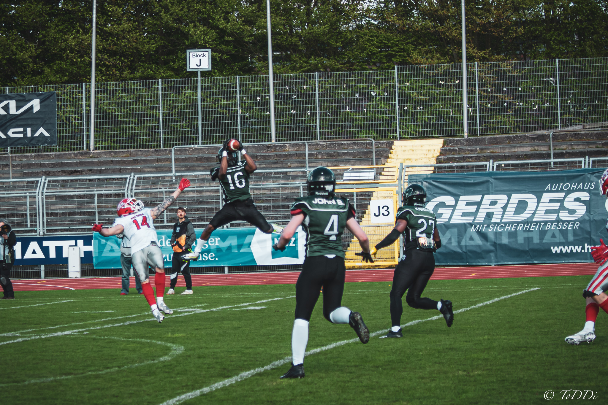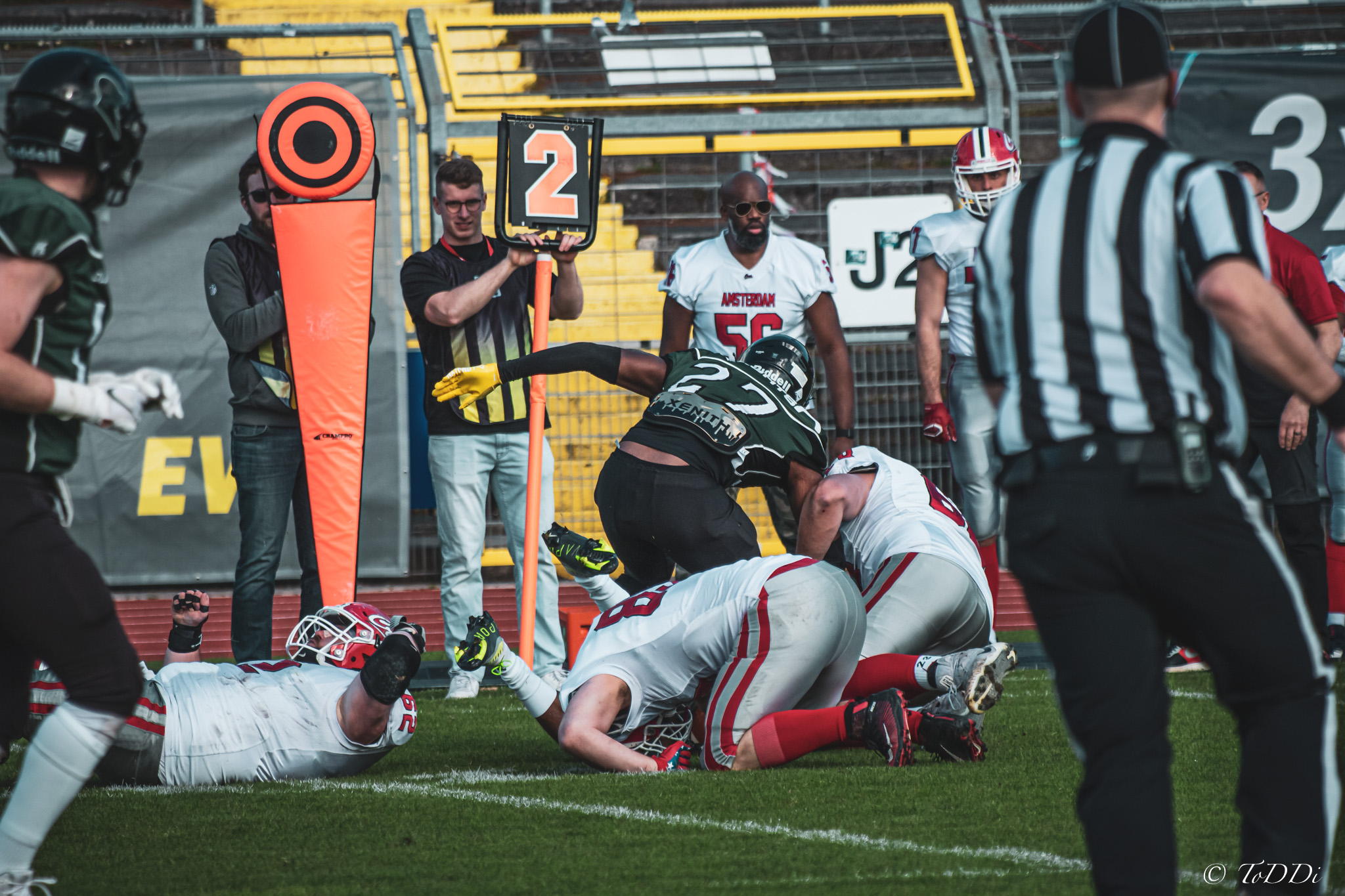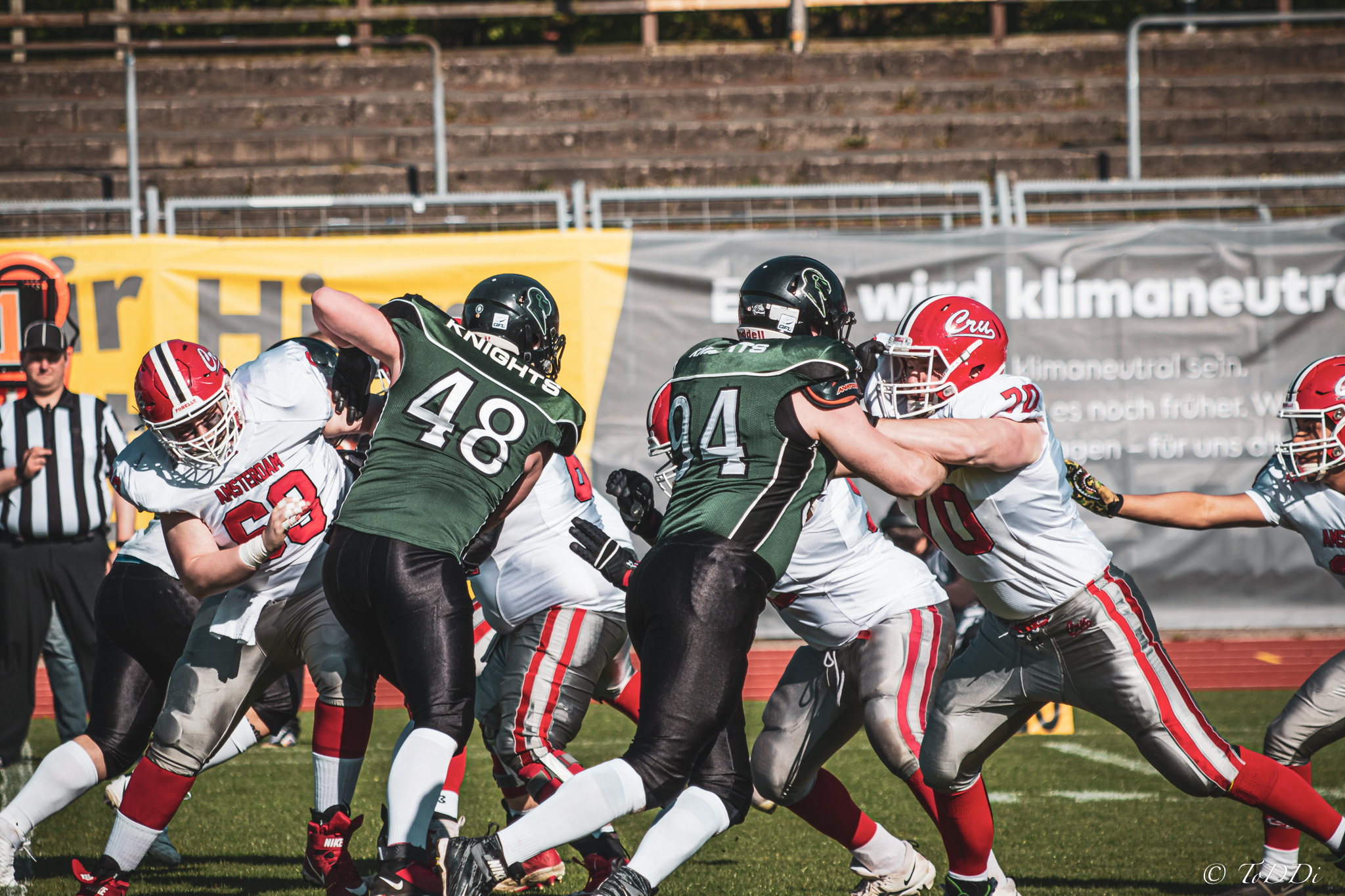 Auch außerhalb des Spielfeldes zeigte man sich auf Seiten der Knights mit der Generalprobe mehr als zufrieden. „Organisatorisch lief schon vieles so wie wir es uns vorgestellt haben und auch mit unserer neuen Videowand waren wir zufrieden“, berichtet Holger Völling, der speziell was die Videowand betrifft noch ein wenig nachjustieren möchte. „Die Frage des Standortes ist hier sehr wichtig da die aufgrund der angezeigten Spielzeit für beide Teams und die Schiedsrichter gut einsehbar sein muss. Wenn sie dann noch für die Zuschauer gut sichtbar ist steht sie natürlich optimal“, zeigte sich Völling mit dem Standort auf der Gegengerade mehr als zufrieden und war erleichtert das auch der Schiedsrichter-Obmann dies so sah. Zufrieden zeigte er sich auch mit der Zuschauerzahl von 992 Zuschauern, darunter 200 Ukrainer, ob der gleichzeitig stattfindenden Bundesligaspiele des VfL und der Baskets. „Wir haben auf jeden Fall gesehen wo noch Verbesserungspotential besteht. Die kommenden Wochen nutzen wir nun für den Feinschliff bei der Mannschaft und in der Organisation“.