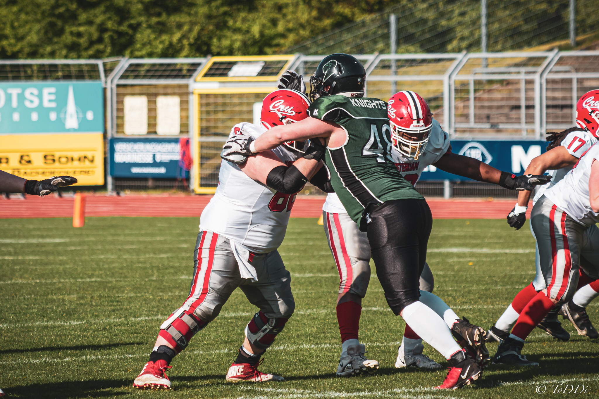 Vier Wochen noch bis zum Saisonstart gegen die Lübeck Cougars und die VfL Oldenburg Knights scheinen bereits in guter Frühform zu sein. Am Samstag empfing man im heimischen Marschweg Stadion den niederländischen Meister Amsterdam Crusaders und konnte diesen mit 23:12 (7:6) besiegen. Im Gegensatz zu den Knights befinden sich die Crusaders bereits mitten in ihrer Saison und sind damit deutlich eingespielter als die Oldenburger, was ihnen am Samstag aber wenig nutzte. Die 992 Zuschauer bekamen in der ersten Halbzeit ein sehr intensiv geführtes Spiel zu sehen in dem die Gastgeber einmal mehr für den ersten Touchdown des Spiels sorgten und so mit 7:0 in Führung gingen. Noch vor der Pause gelang auch den Gästen ihr erster Touchdown. Allerdings verpasste man die Chance per Extrapunkt auszugleichen, so dass es mit einer 7:6 Führung für die Hausherren in die Kabinen ging. Nach der Pause konnten die Knights dann Fehler in der gegnerischen Offense konsequent für sich ausnutzen und durch zwei weitere Touchdowns, sowie einem Field Goal die Führung auf 23:6 ausbauen. Zwar gelang den Gästen wenig später noch ihr zweiter Touchdown, aber zu mehr sollte es nicht mehr reichen. „Es war das erwartet körperbetonte Spiel auf Augenhöhe, mit einem positiven Endergebnis für uns. Allerdings haben sich auch noch einige Baustellen aufgetan an denen wir in den nächsten vier Wochen noch intensiv dran arbeiten müssen“, zeigte sich Cheftrainer Marcus Meckes speziell mit dem Passspiel seines Teams, bisher eine der Stärken der Knights, wenig zufrieden. „Es hat sich stark bemerkbar gemacht das mit Christoph Oetken (Karriereende), Johann Kruthaup und Rudolf Henne (beide verletzt) drei erfahrene Passempfänger gefehlt haben. Wir haben viel mit jungen Spielern gespielt und die sind halt noch nicht soweit“. Für die Punkte sorgten die Running Backs Neuzugang Terry Hunter Jr. (2 Touchdowns) Nils Bünger (1 TD) sowie Kicker Darrian Naujoks mit zwei Extrapunkten sowie einem Field Goal.